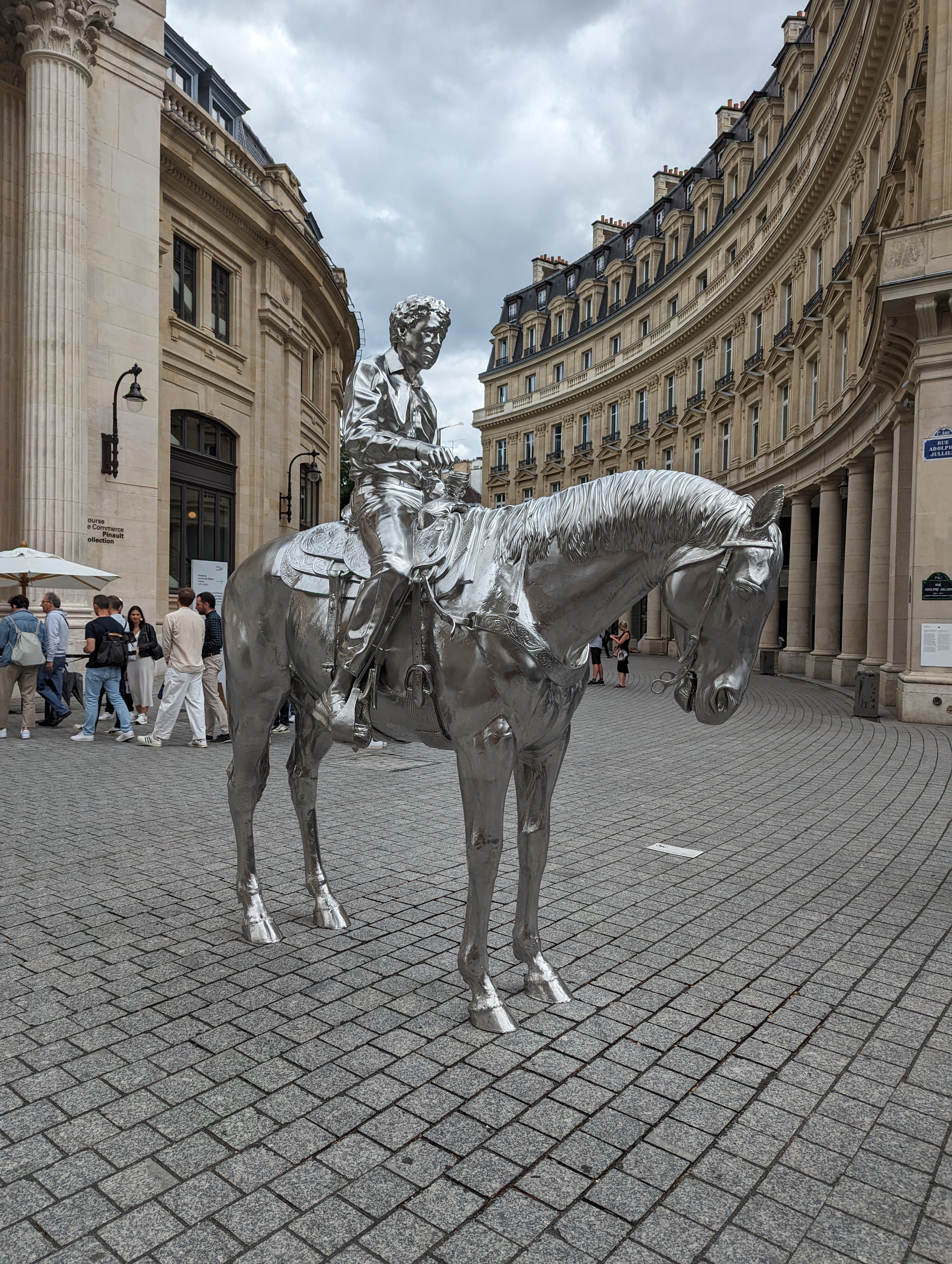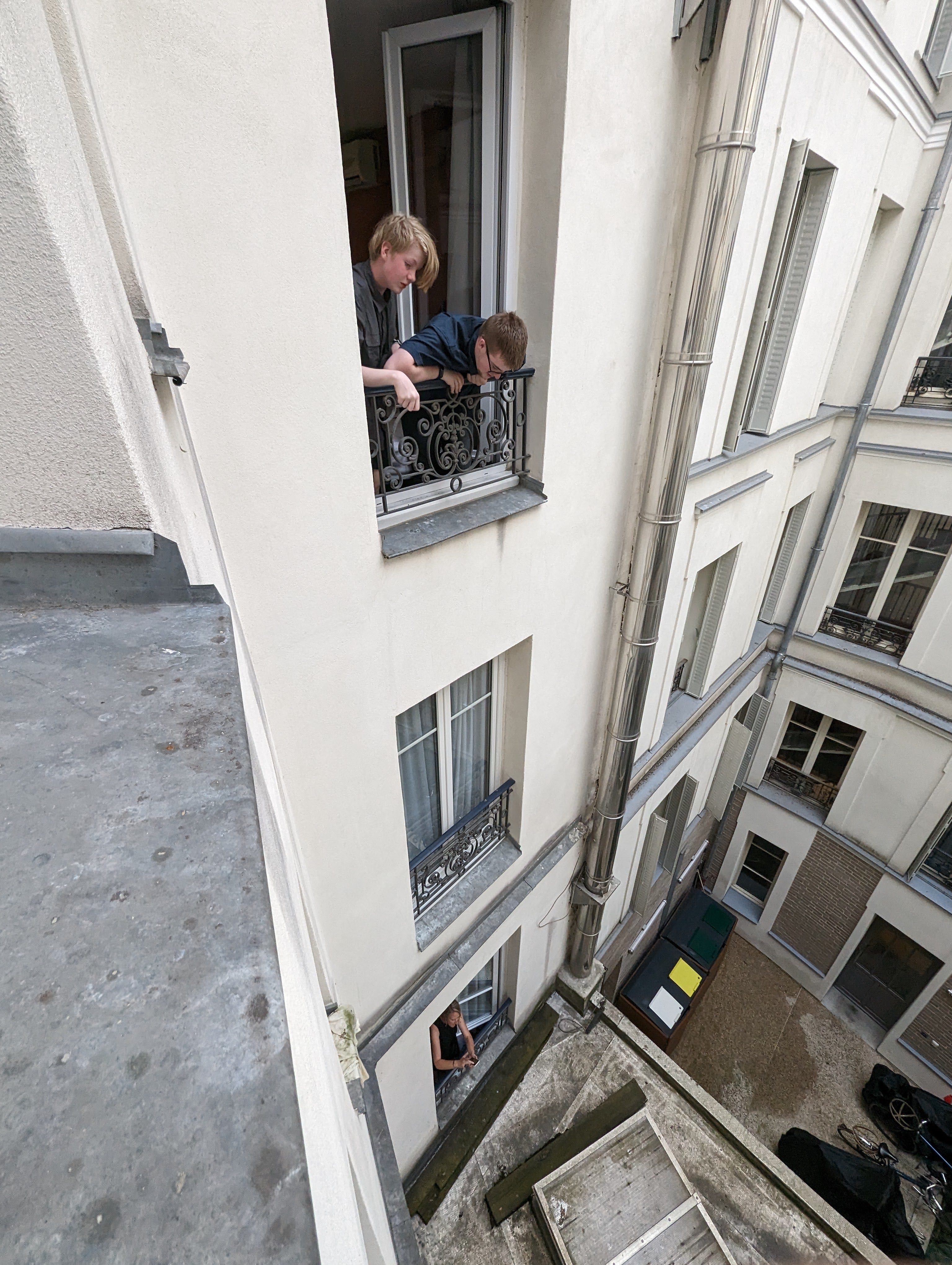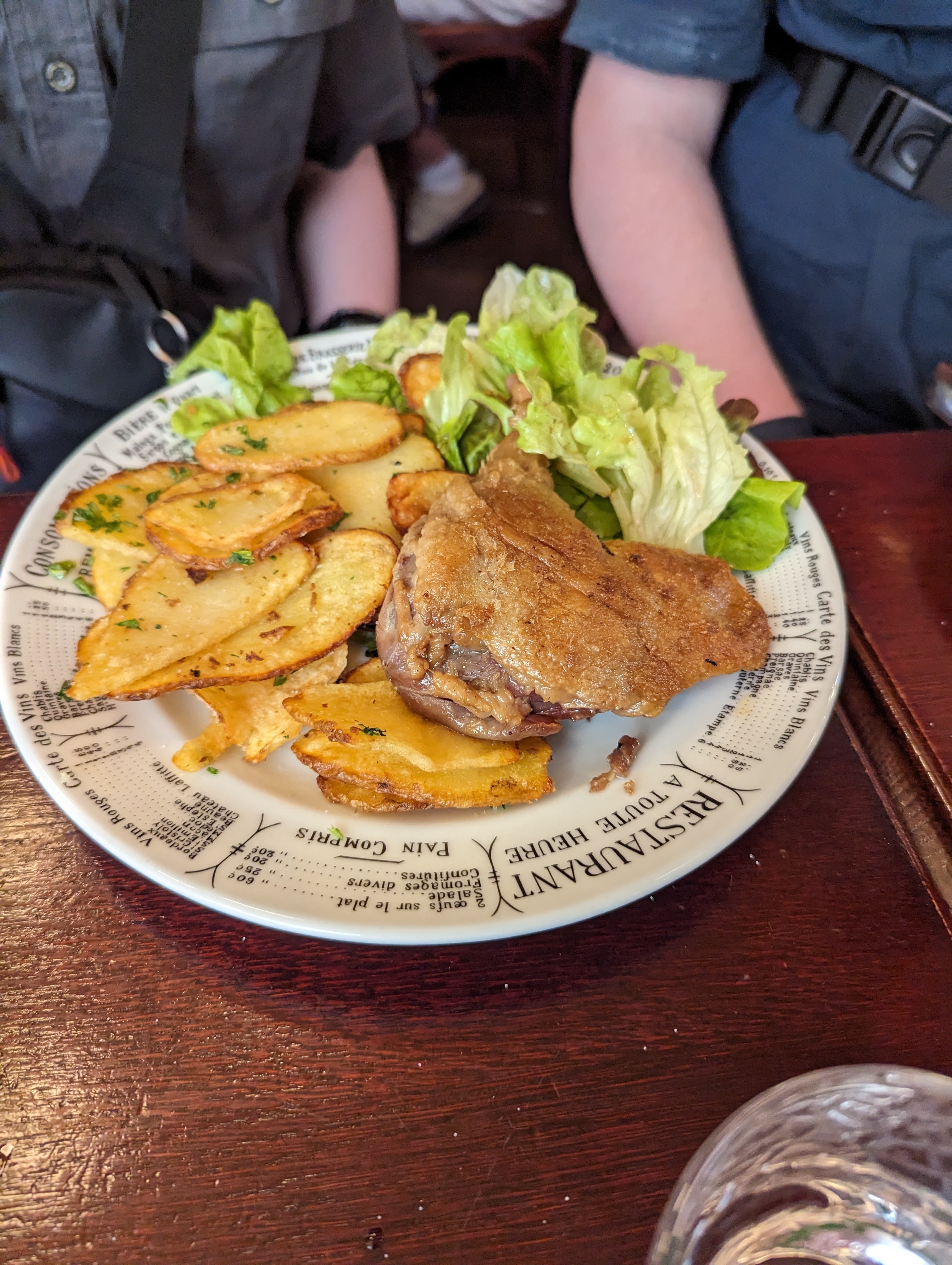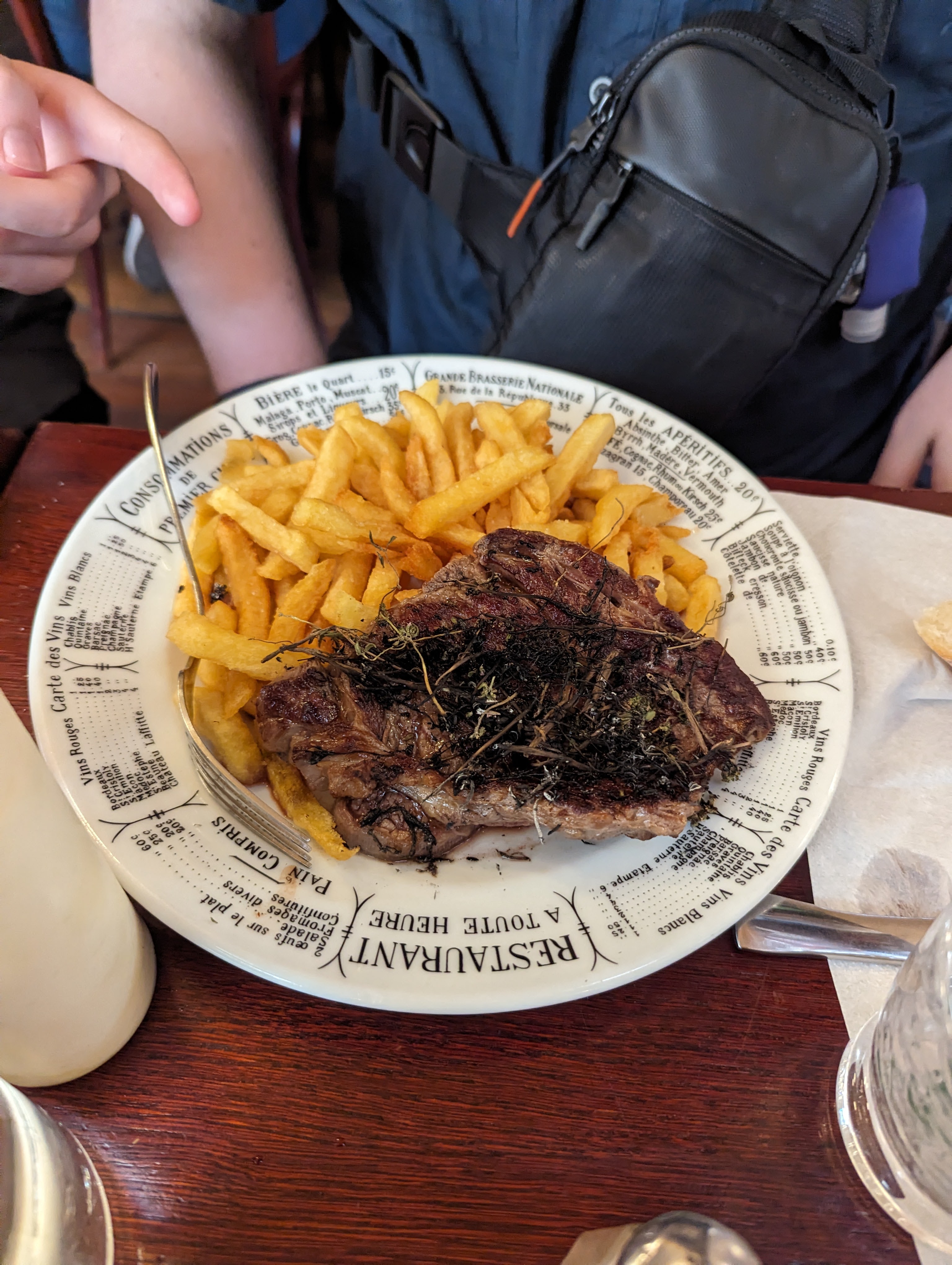We continued on our way through Paris to a restaurant called Bistrot Victoires. It is a French place that has reasonable prices. Obviously popular as we had to wait a while – particularly since there were 6 of us. Made do in the rain before we were seated. It was so cool. We had 2 kinds of steak, duck confit, and chicken. All of it was super tasty. Graeme ordered escargot and everyone had one, even Colin and Zane. Took Zane a while, but once he tried it, he said he liked it apart from the fact that he knew he was eating a snail.
