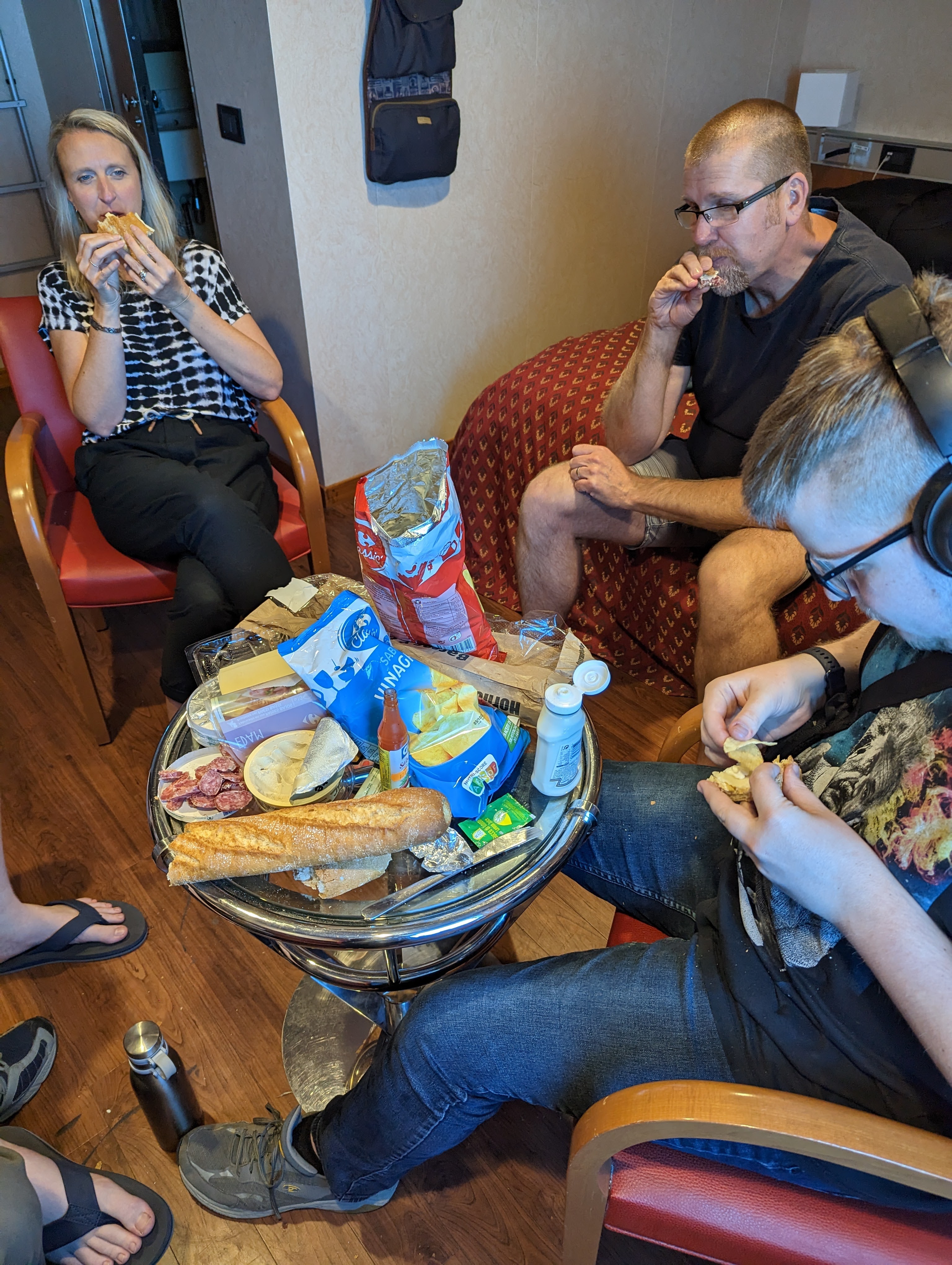 Got up at 9 am to meet G&B for breakfast at 930. We all paid 3 euros or so at booking to get breakfast. It was 2 rolls, jam and butter or a croissant, plus juice and coffee. The rolls were a bit tough, but it wasn’t bad. It actually feels kind of good to not have a giant breakfast. We are now enjoying some time apart to write and recharge. Meeting up again soon. I think that this ferry trip and the train trips we will have between cities will be a good time to reset and recharge. We’ve also come to realize that with our limited time in each place, we don’t have to do it all. A couple of memorable things, some good food, walking around, these are the things that are going to be healthy for us.