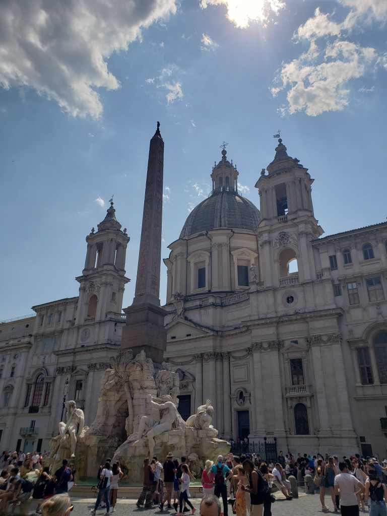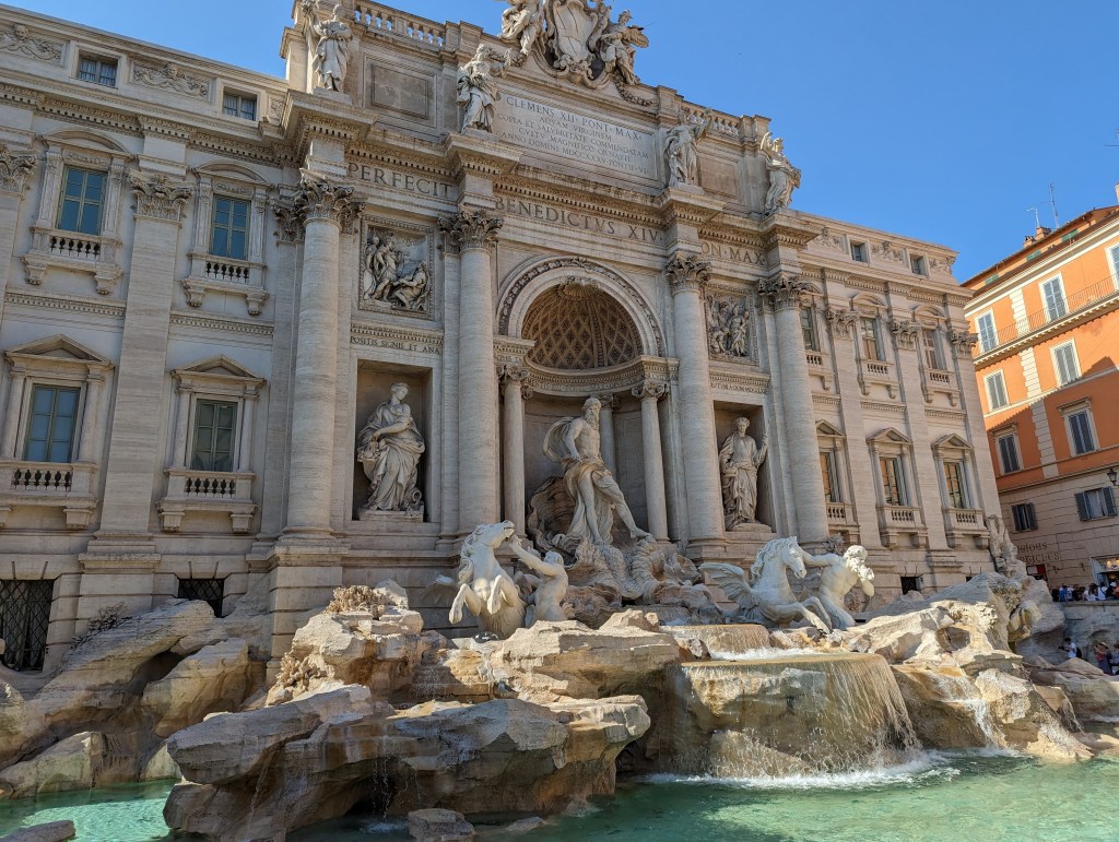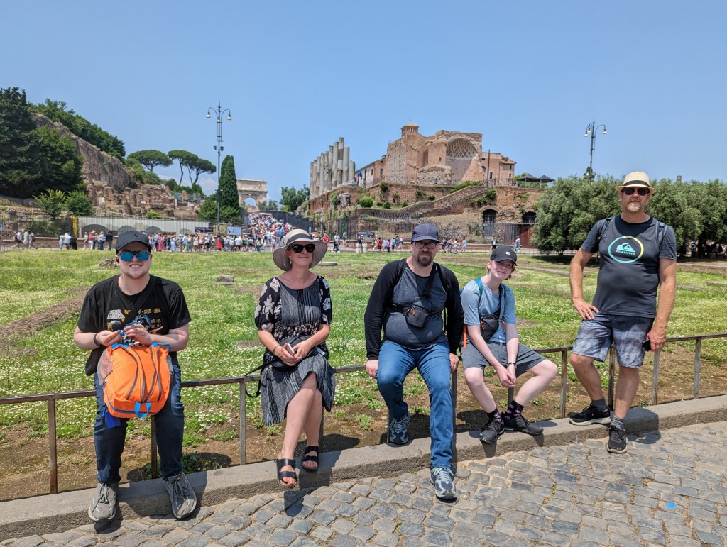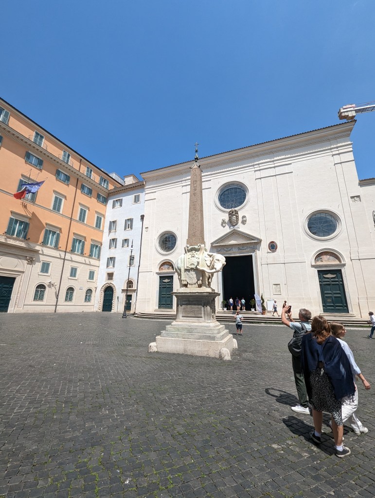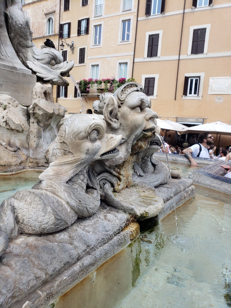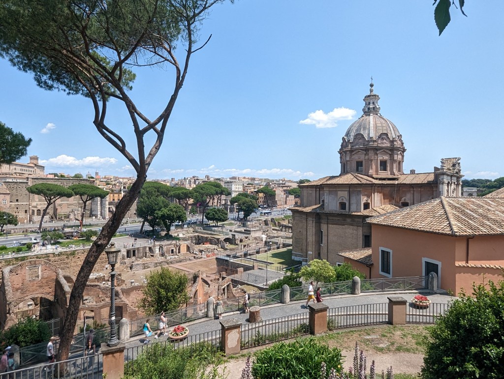 We covered a lot of ground today. We saw the Colosseum, Roman Forum, Santa Maria Sopra Minerva, Piazza del Campidoglio, Pantheon, Trevi Fountain, Spanish Steps, and so much more. The layers of history, the modern bleeding into the ancient. The moments of cool and calm when you walk into a church from the city street. The boys know quite a lot about Roman history so it’s fun to hear them talk about it and learn from them. We found this lovely hidden garden with a view of the city. We took a break there. It has a water fountain nearby to refill our bottles.