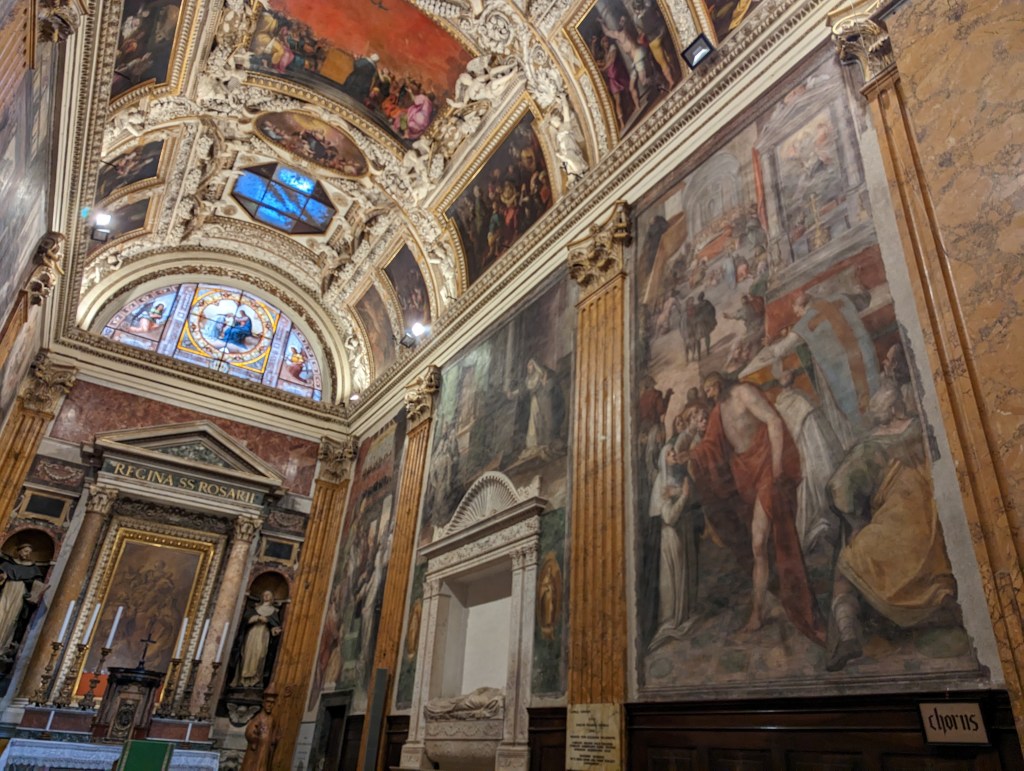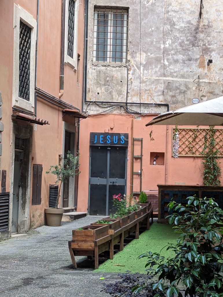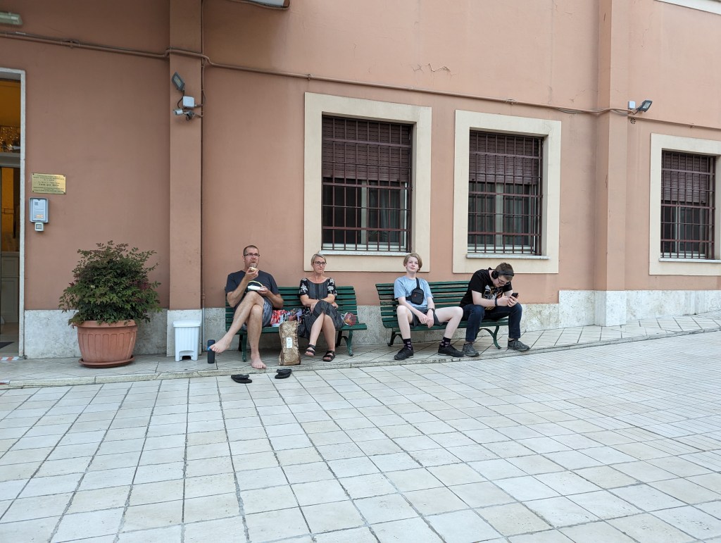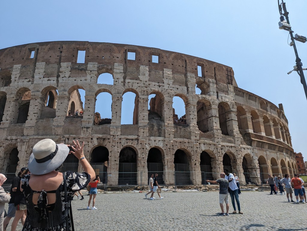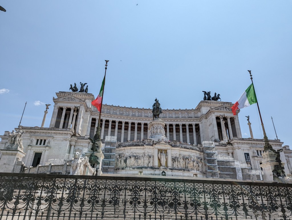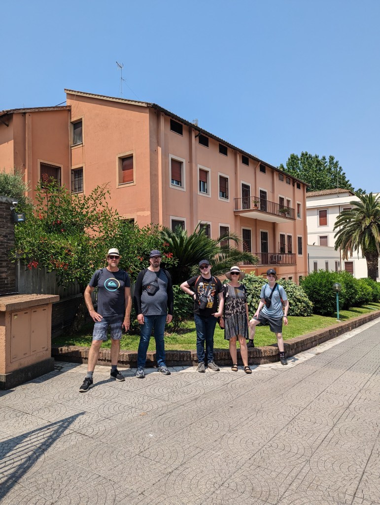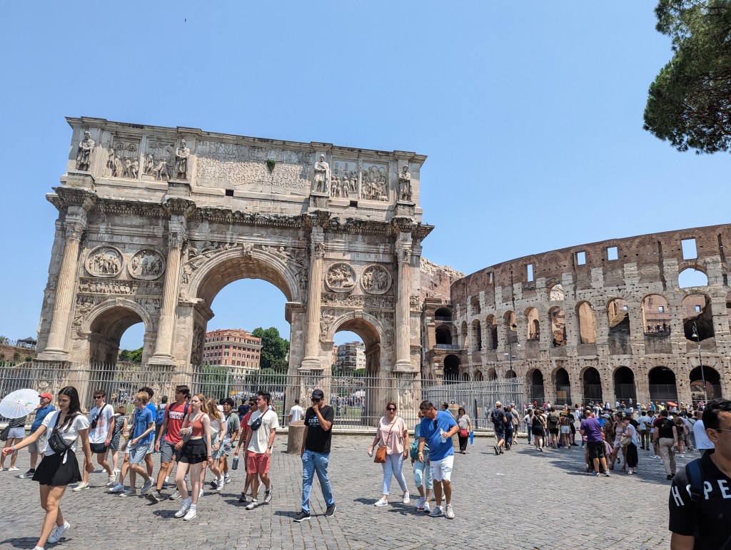 We covered a lot of ground today. We saw the Colosseum, Roman Forum, Santa Maria Sopra Minerva, Piazza del Campidoglio, Pantheon, Trevi Fountain, Spanish Steps, and so much more. The layers of history, the modern bleeding into the ancient. The moments of cool and calm when you walk into a church from the city street. The boys know quite a lot about Roman history so it’s fun to hear them talk about it and learn from them. We found this lovely hidden garden with a view of the city. We took a break there. It has a water fountain nearby to refill our bottles.