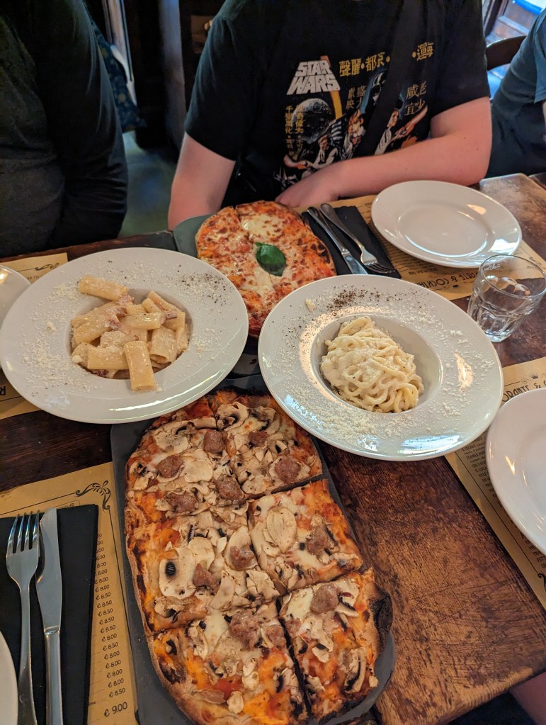 We had a yummy Italian meal of pasta and pizza in a gloriously air conditioned restaurant. Zane tried and enjoyed some new things.